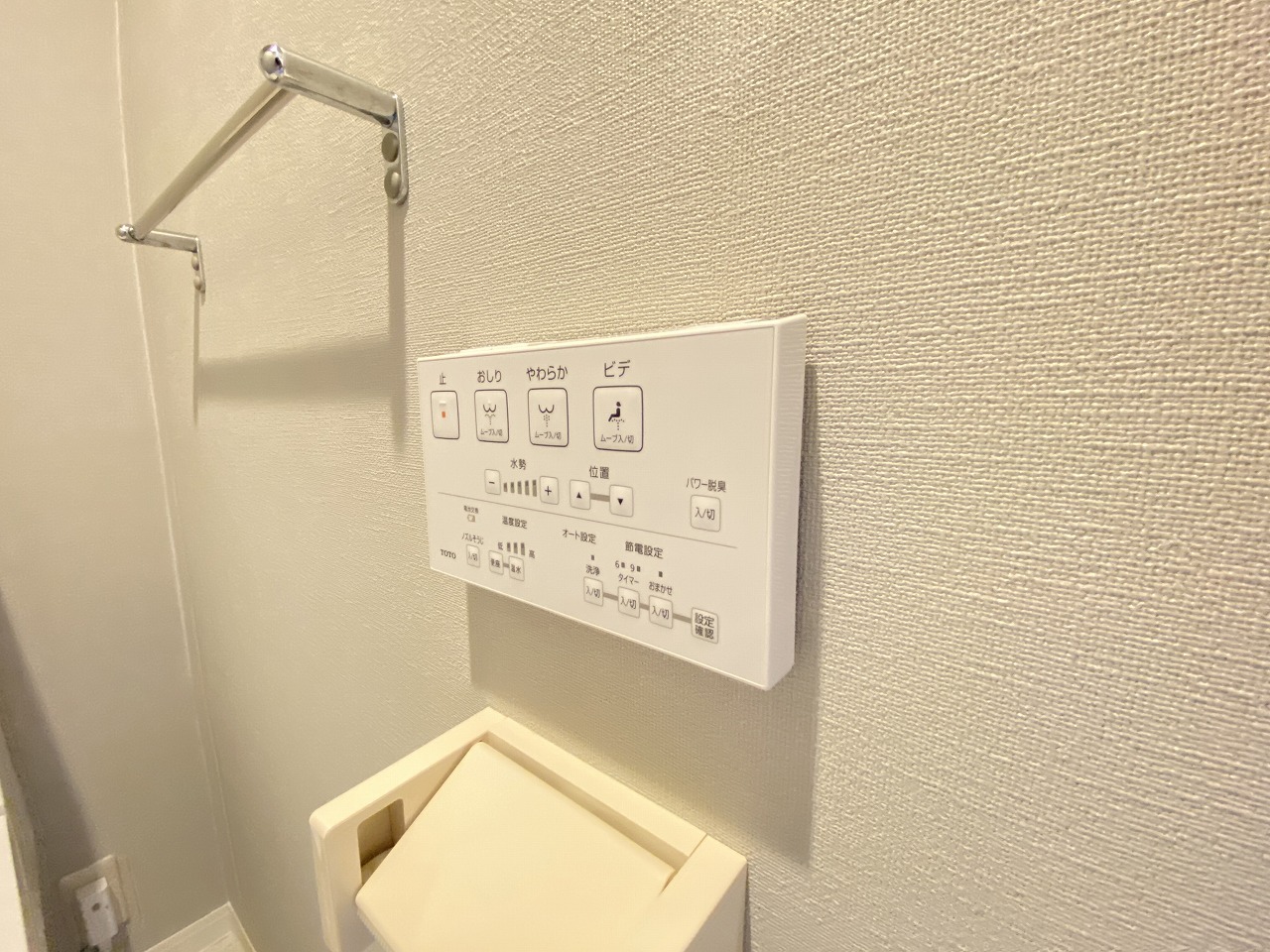 もちろんウォシュレット機能付き。憩いの場としてひそかに注目度の高いお手洗いにもご注目ください。