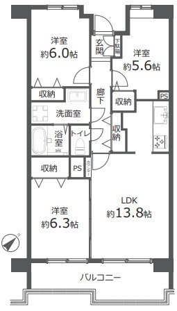 | 間取 | 3LDK (LDK13.8帖、洋室6.3帖、洋室6.0帖、洋室5.6帖) | ||