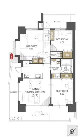 | 間取 | 3LDK (洋室6帖、洋室5.6帖、洋室4.5帖、LDK12.7帖) | ||