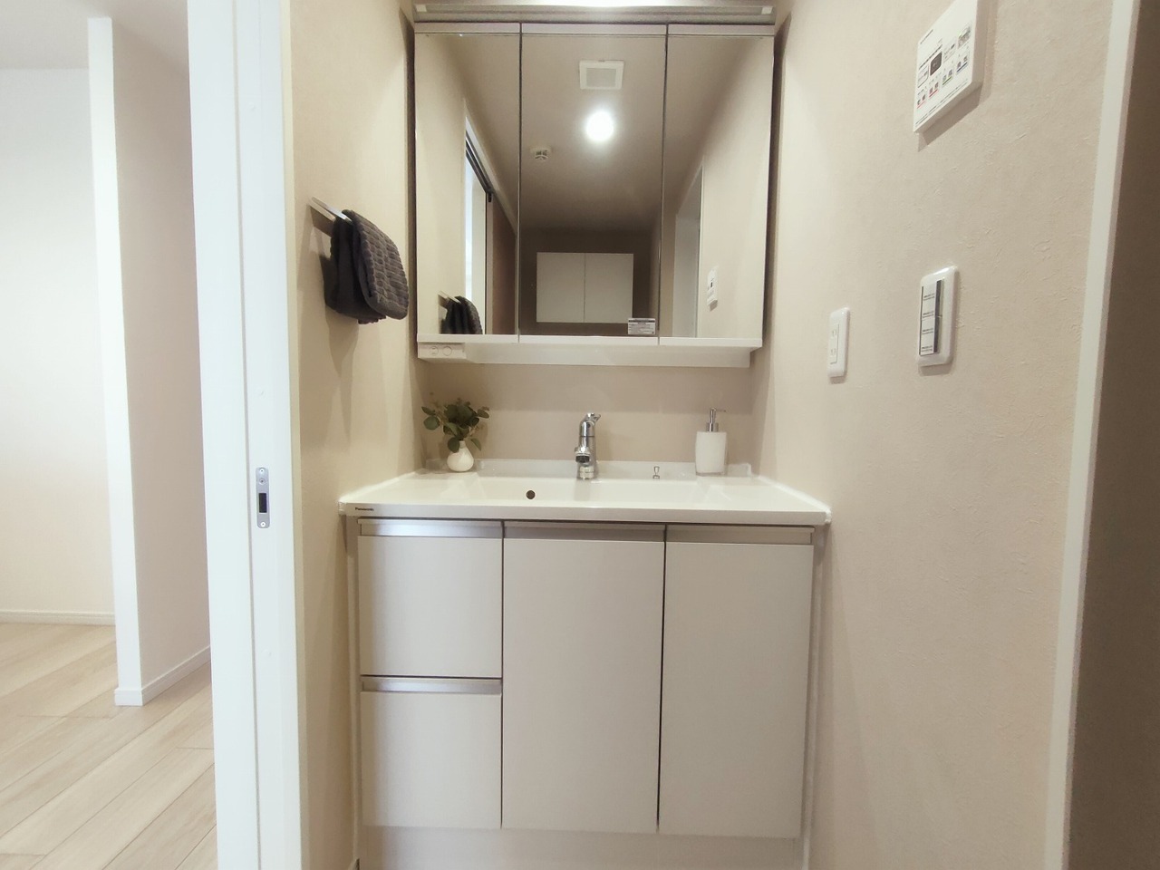 三面鏡を採用した洗面化粧台。鏡の裏にも収納スペースがあります。