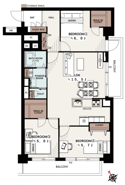 | 間取 | 3LDK (LDK15.5帖、洋室6.0帖、洋室5.7帖、洋室5.0帖) | ||