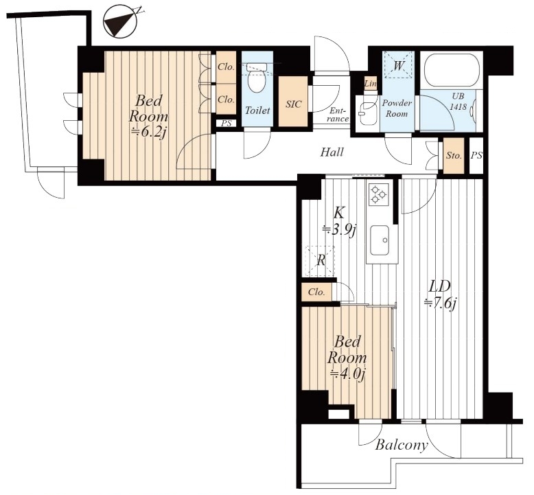| 間取 | 2LDK (洋室6.2帖、洋室4帖、LD7.6帖、K3.9帖) | ||