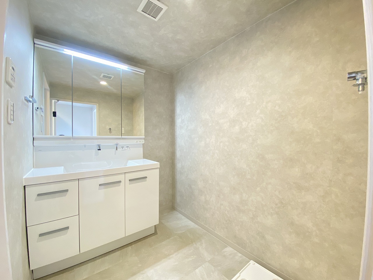 洗面化粧台は清潔感の漂うホワイトをベースカラーに、シンプルなデザインで。