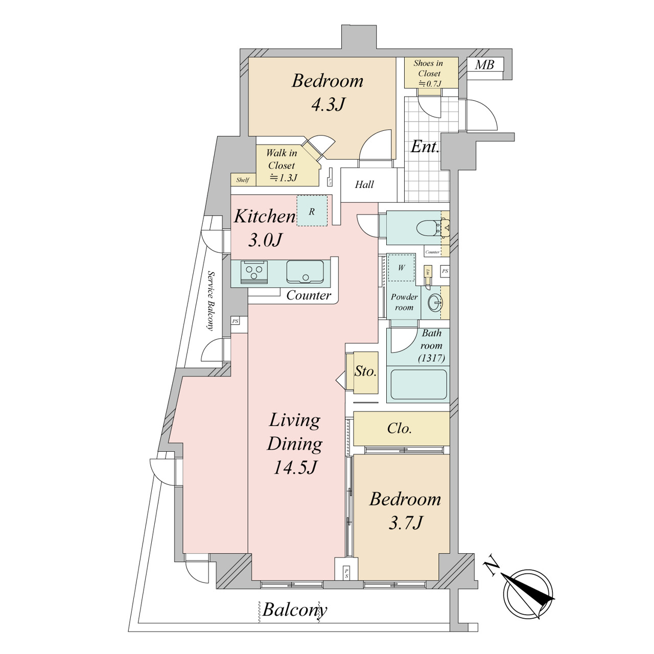| 間取 | 2LDK (LDK17.5帖、洋室4.3帖、洋室3.7帖) | ||