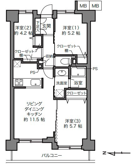 | 間取 | 3LDK (LDK11.5帖、洋室5.7帖、洋室5.2帖、洋室4.2帖) | ||