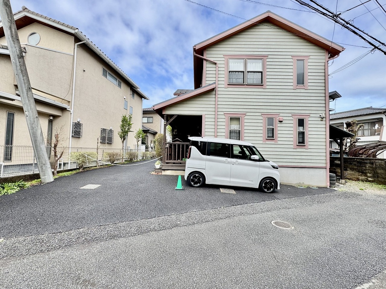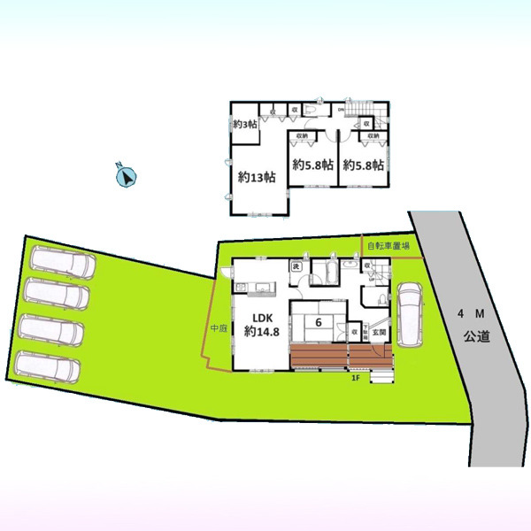 駐車場は停めやすい広さで5台可、家庭菜園も楽しめる。敷地のびのび90坪。