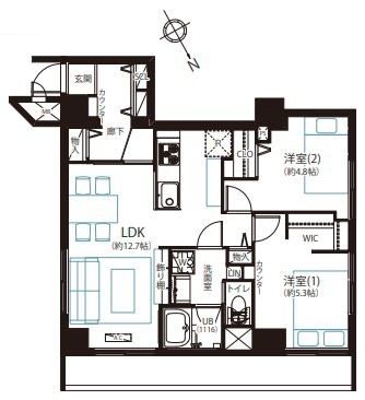 | 間取 | 2LDK (LDK12.7帖、洋室5.3帖、洋室4.8帖) | ||