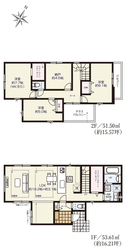 LDK15帖以上床下収納テラス間取り変更可能床暖房食器洗浄機浄水器省エネ給湯器システムキッチンカウンターキッチントイレ2ヶ所温水洗浄便座浴室乾燥機浴室暖房リビング階段ウォークインクローゼットTVモニタ付インターホン24時間換気システム小学校800m以内保育園・幼稚園800m以内フラット35Sに対応