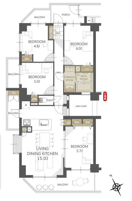 | 間取 | 4LDK+ロフト6.40平米 (LDK15.0帖、洋室6.0帖、洋室5.7帖、洋室5.0帖、洋室4.8帖) | ||