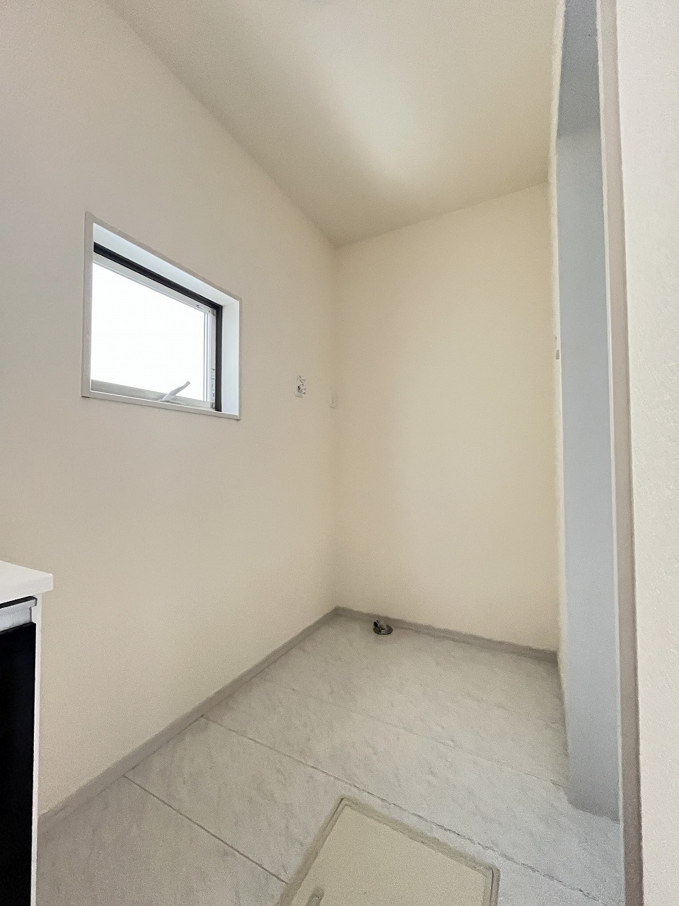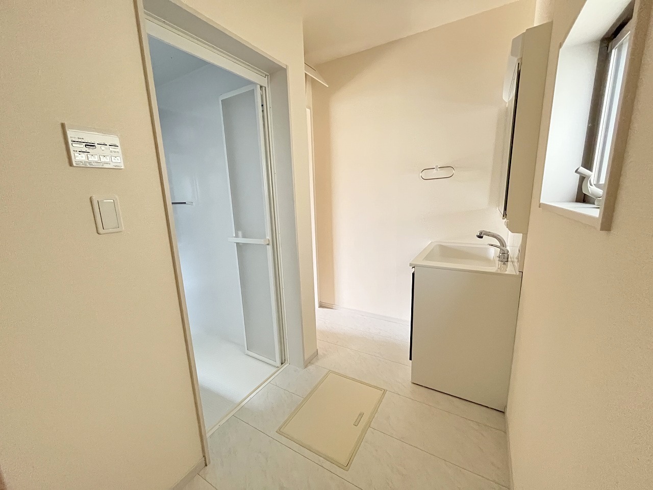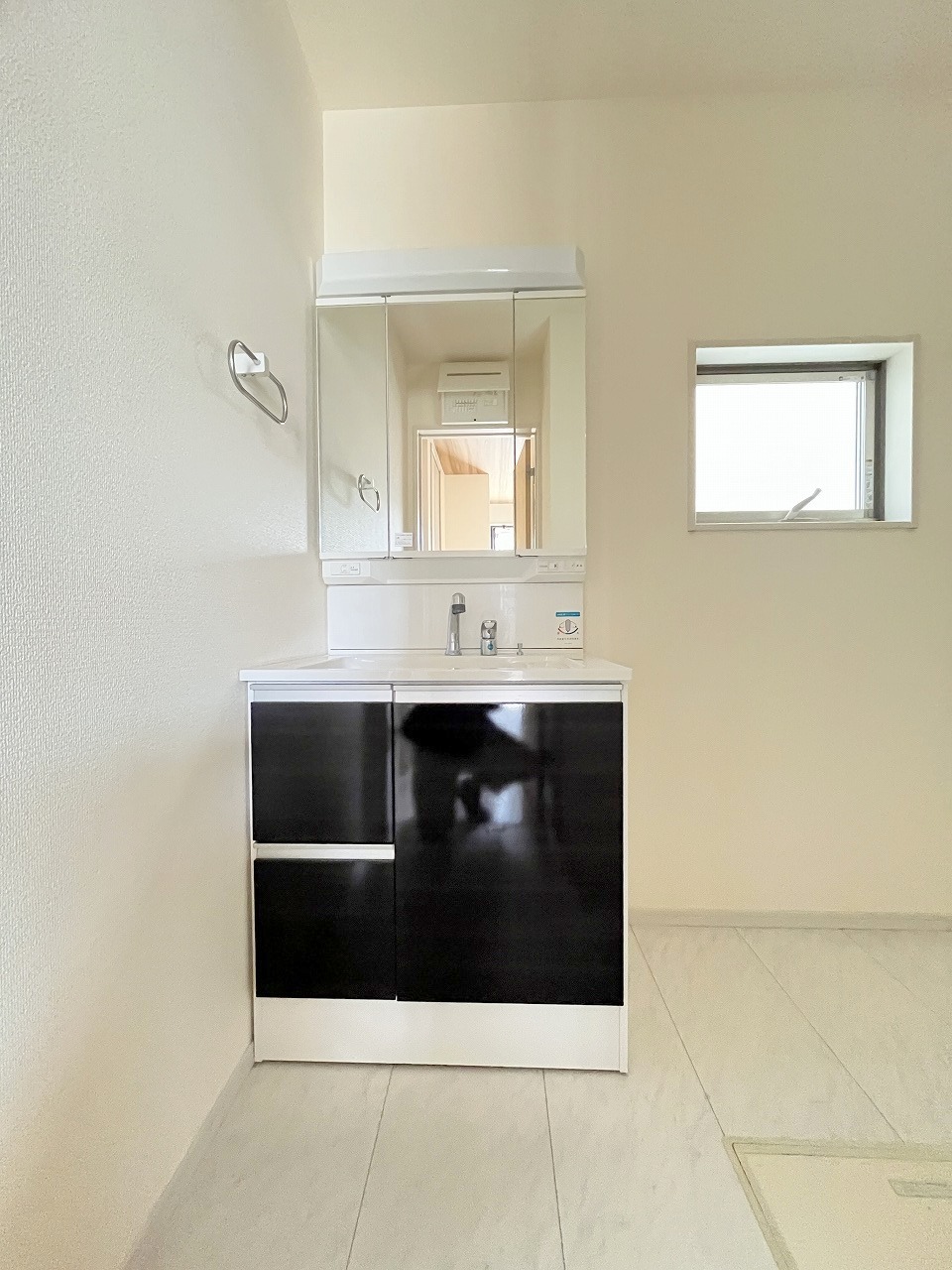 収納豊富な三面鏡付洗面化粧台。水回りのあれこれがキレイに収まりそうですね。