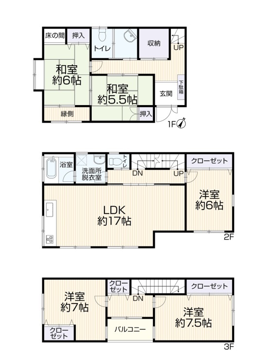 17帖の広々リビングが自慢の3階建て5LDKは、収納も豊富です。