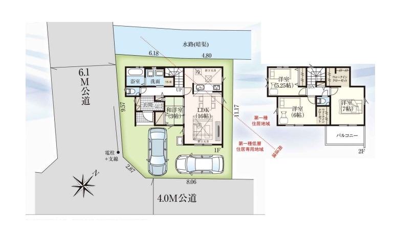 | 接道 | 南東側4M公道に8.06M接道 北東側6.1M公道に9.57M接道 |