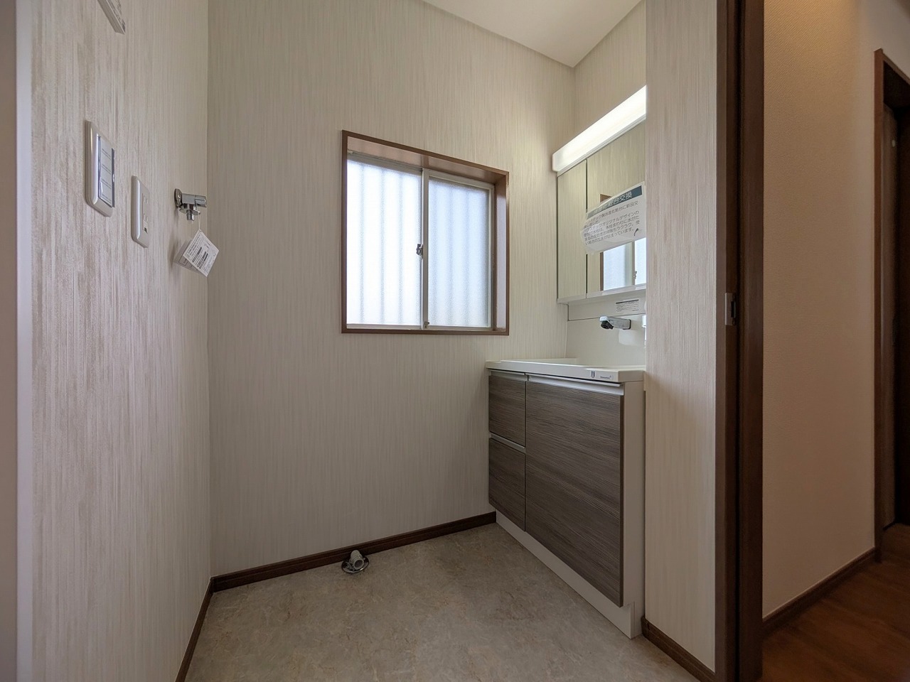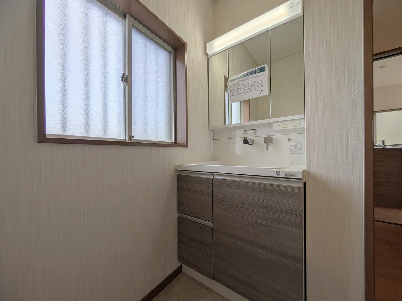三面鏡を採用した洗面化粧台。鏡の裏にも収納スペースがあります。