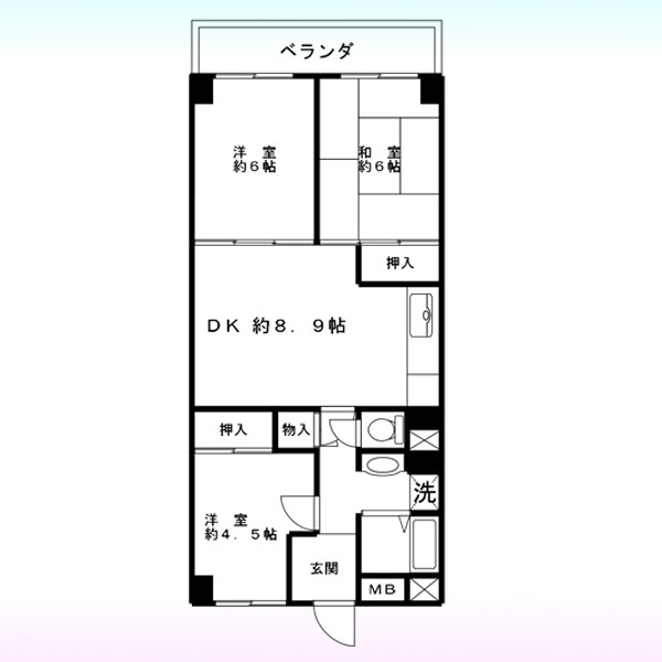| 間取 | 3DK (DK8.9帖、和室6帖、洋室6帖、洋室4.5帖) | ||