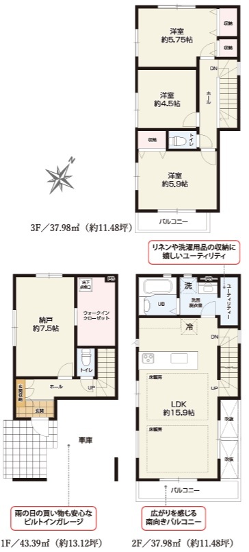 | 間取 | 3SLDK+WIC、ユーティリティー (LDK15.9帖、S7.5帖、洋室5.9帖、洋室5.75帖、洋室4.5帖) | ||
