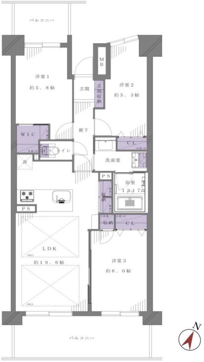 | 間取 | 3LDK (LDK19.6帖、洋室6.0帖、洋室5.8帖、洋室5.3帖) | ||