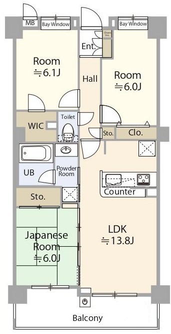 | 間取 | 3LDK (LDK13.8帖、洋室6.1帖、洋室6帖、和室6帖) | ||