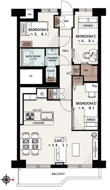 | 間取 | 3LDK (LDK14.1帖、洋室3.8帖、洋室4.5帖、洋室4.0帖) | ||