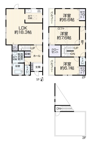 | 間取 | 3LDK (LDK18.3帖、洋室7.6帖、洋室6.6帖、洋室6.1帖) | ||
