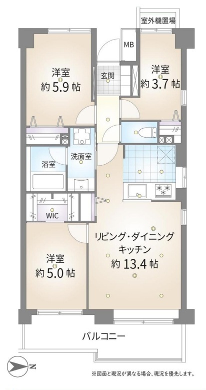 | 間取 | 3LDK (LDK13.4帖、洋室5.9帖、洋室5帖、洋室3.7帖) | ||