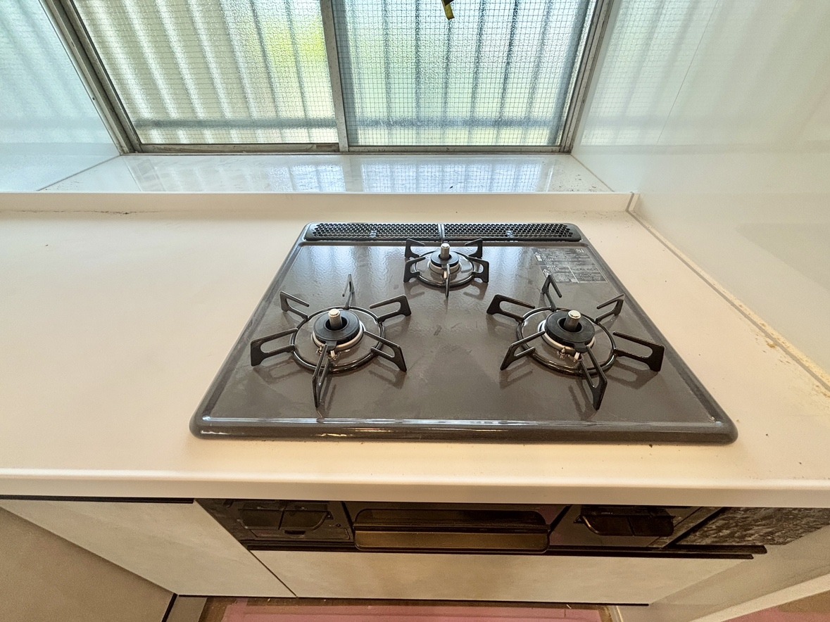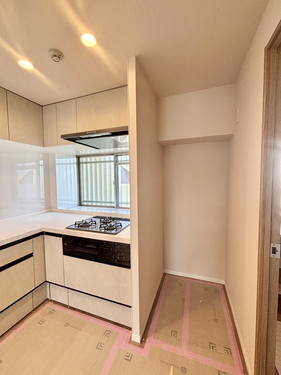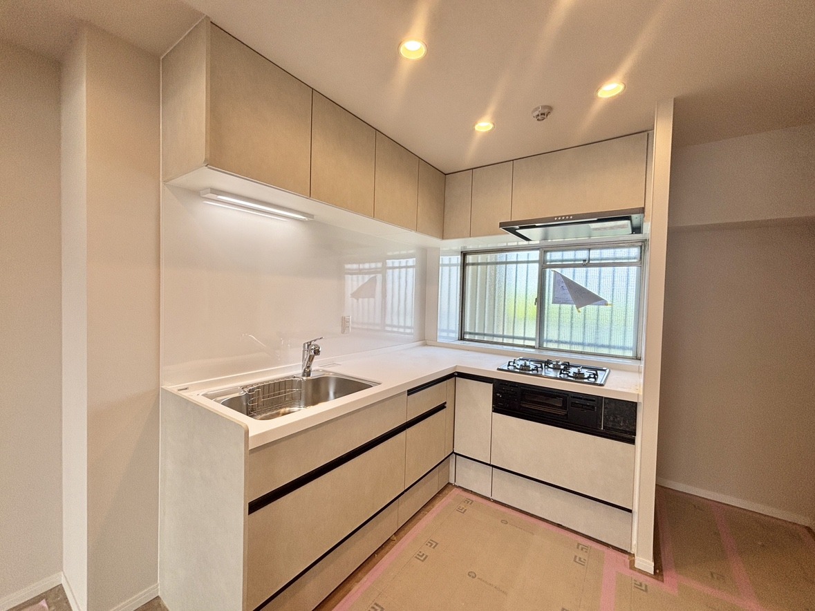 収納量豊富なシステムキッチン。明るい光が差し込む窓も調味料置き場などに役立ちます。カウンターキッチンと違い、背面を広く使えるので自由度が高いのも嬉しいですね。