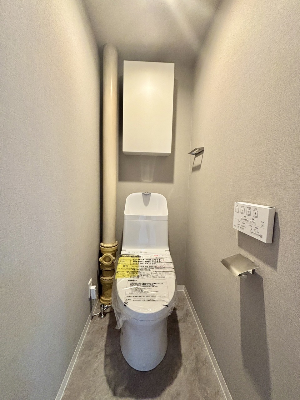 ウォシュレット機能付きのトイレ。収納もあり実用性も兼ね備えた造り。