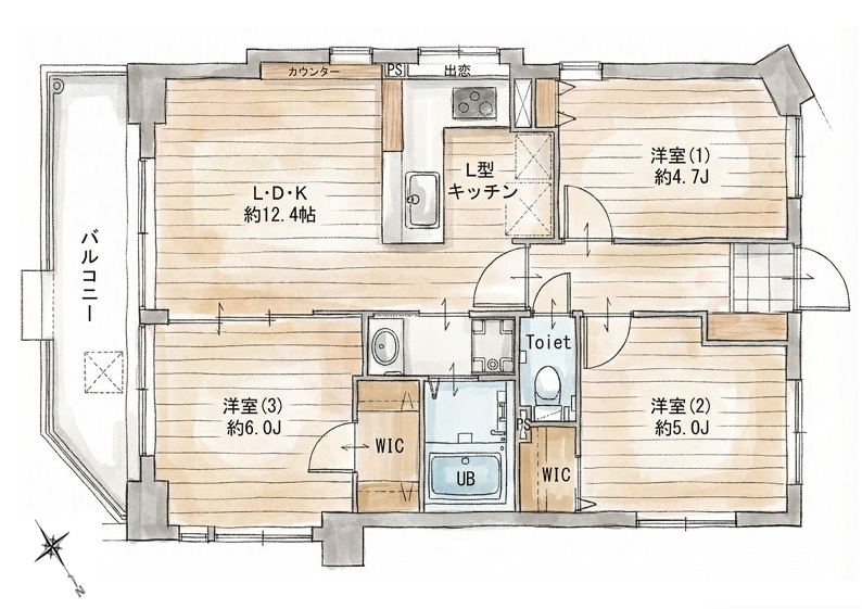 | 間取 | 3LDK+WIC (LDK12.4帖、洋室6.0帖、洋室5.0帖、洋室4.7帖) | ||