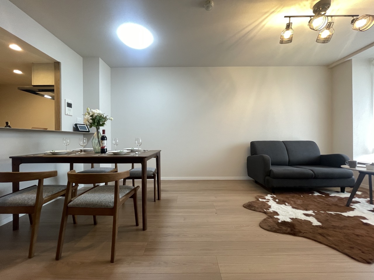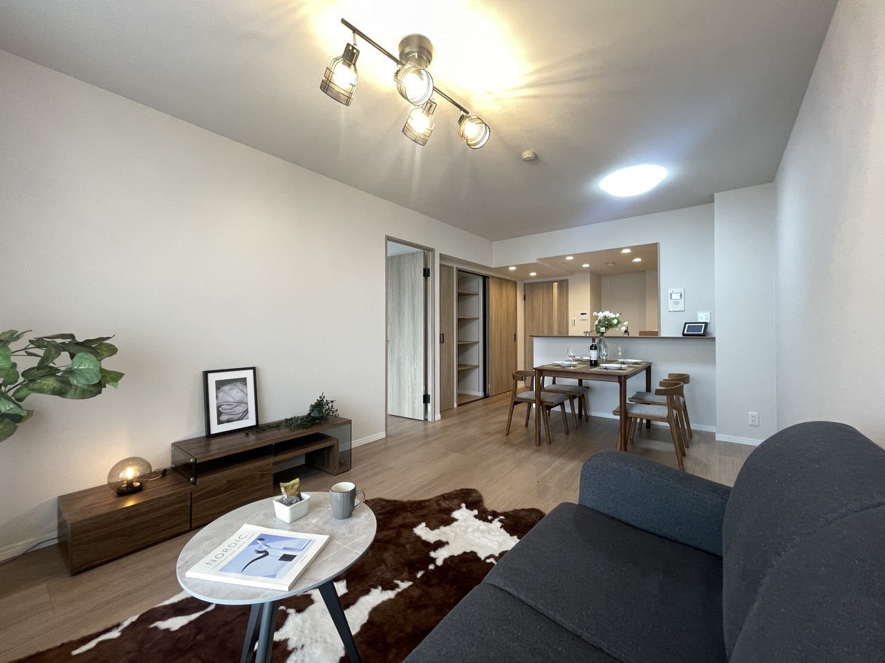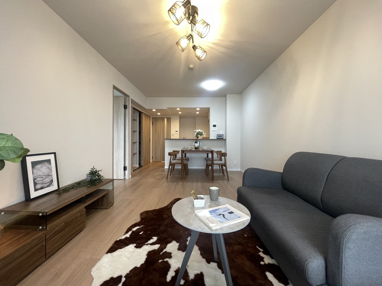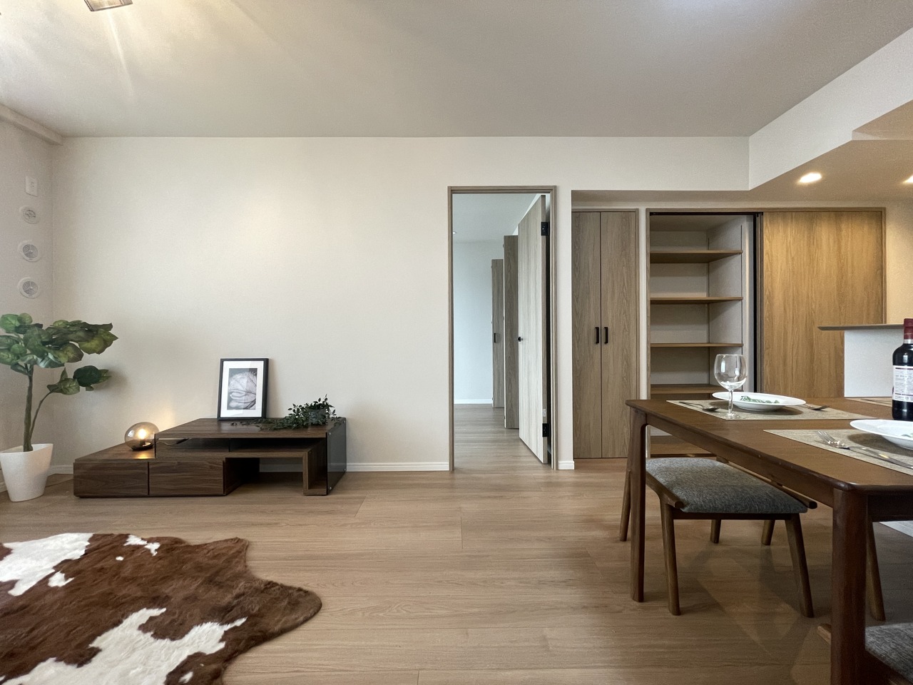 大画面TVの配置も可能なワイドリビング。ホームステージングで生活のイメージが付きやすいです。