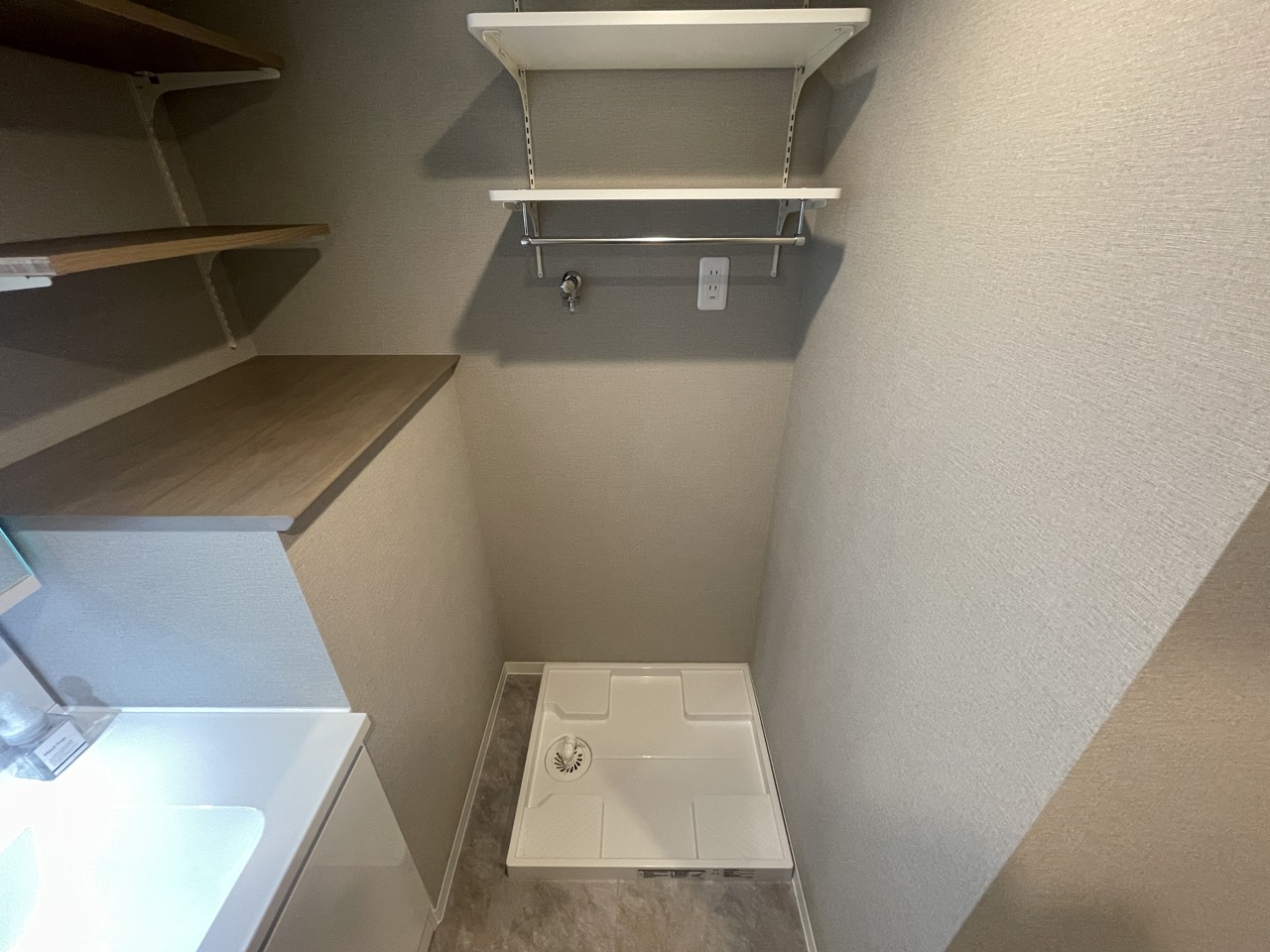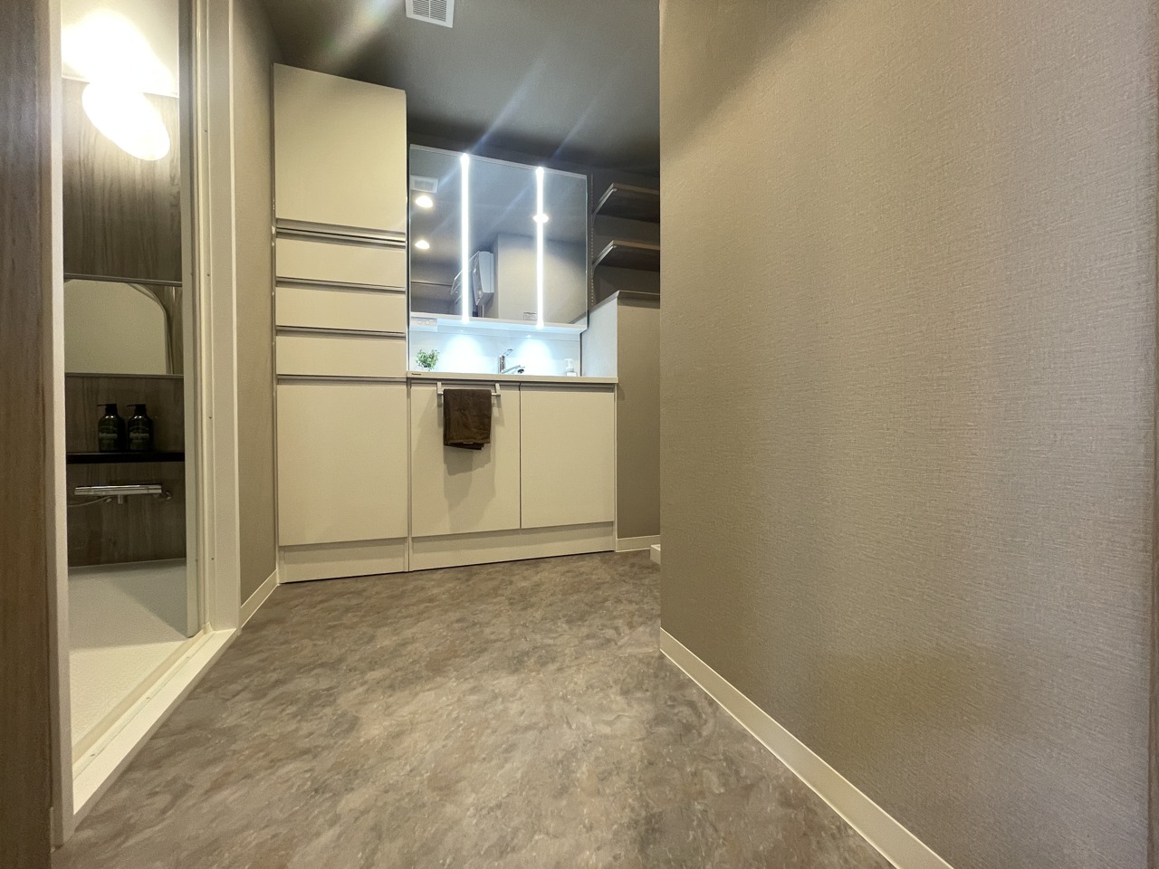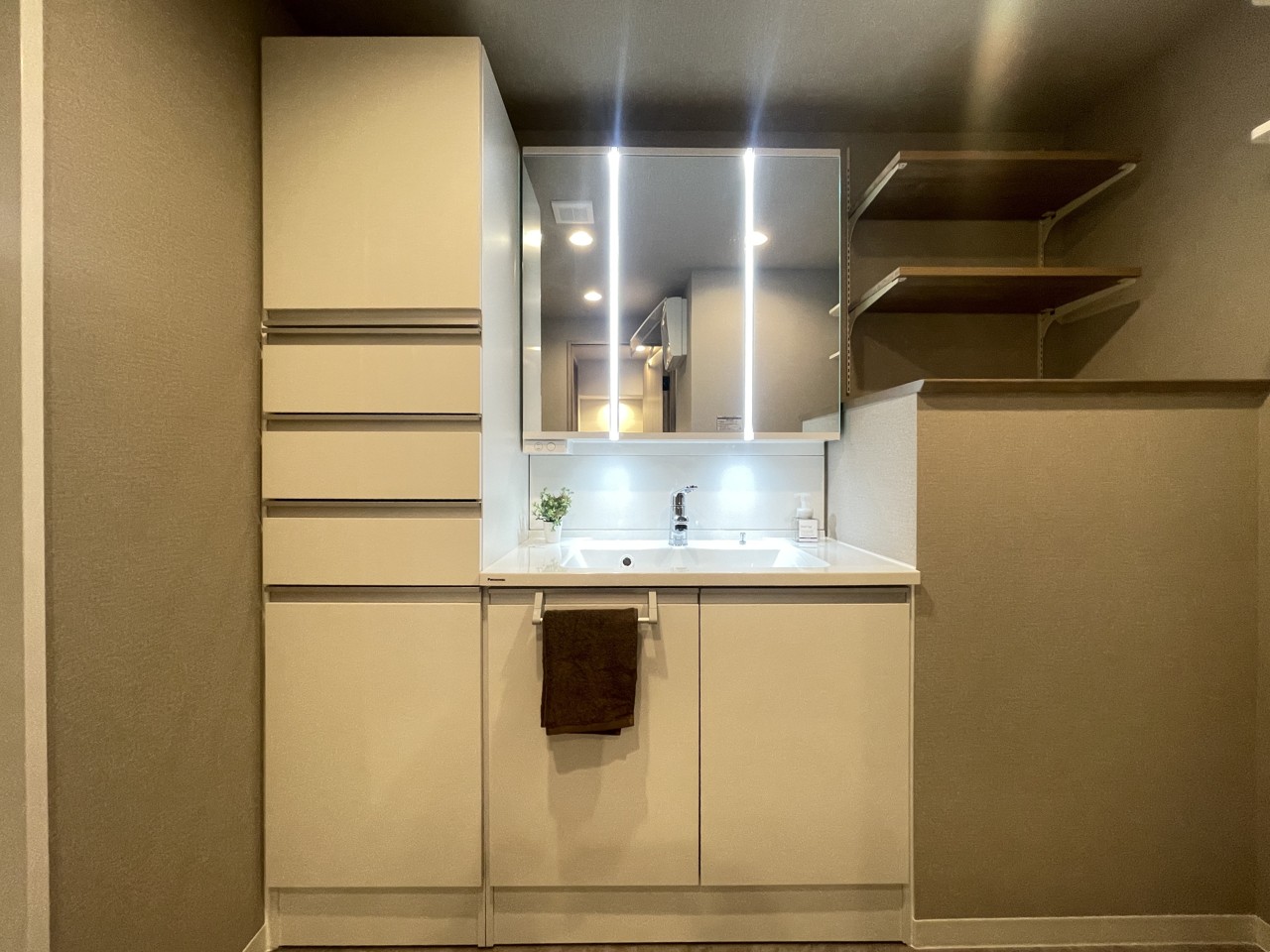 収納豊富な三面鏡付洗面化粧台。水回りのあれこれがキレイに収まりそうですね。