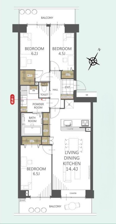 | 間取 | 3LDK + 洋6.5×1・洋6.2×1・洋4.5×1・LDK14.4×1 | ||