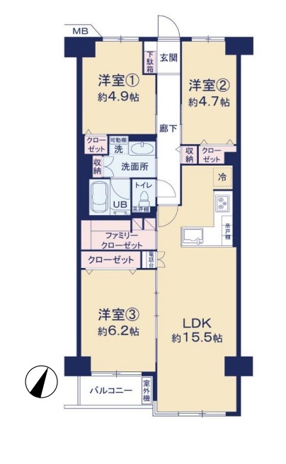 | 間取 | 3LDK (LDK15.5帖、洋室6.2帖、洋室4.9帖、洋室4.7帖) | ||