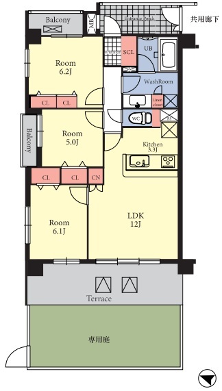 | 間取 | 3LDK (LD12帖、K3.3帖、洋室6.2帖、洋室6.1帖、洋室5.0帖) | ||