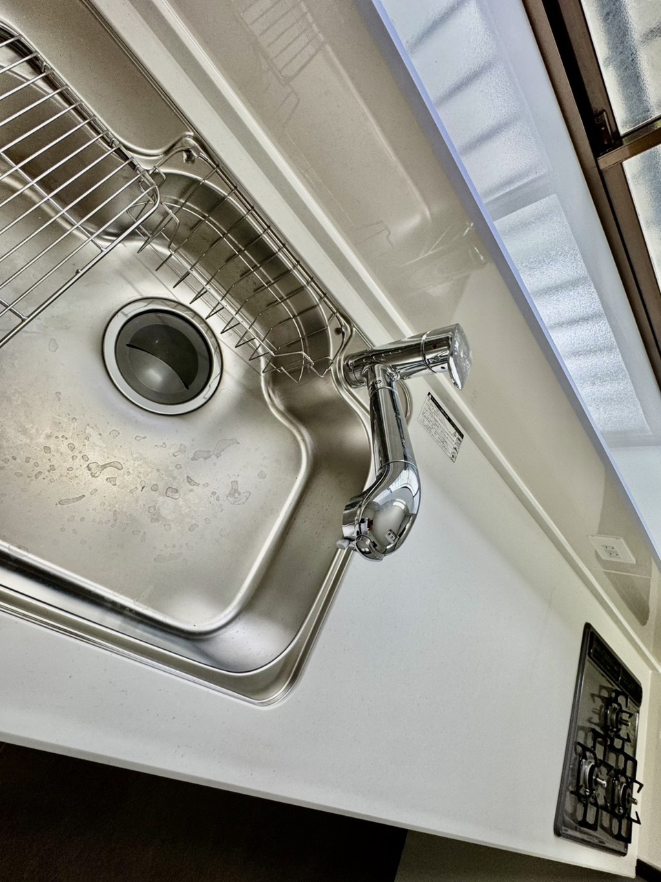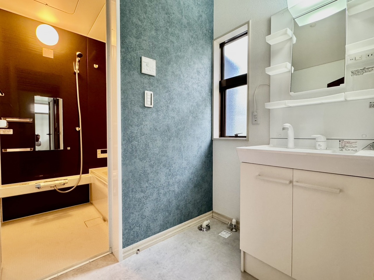 三面鏡にハンドシャワー付き、 使いやすい洗面台。