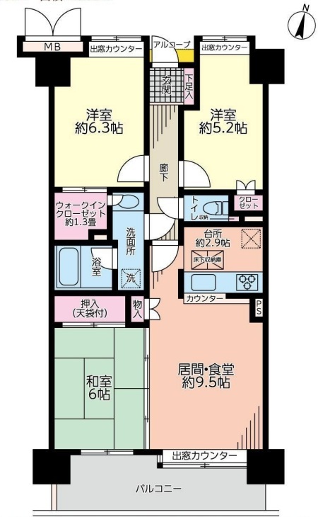 | 間取 | 3LDK+WIC (LDK9.5帖、K2.9帖、和室6帖、洋室6.3帖、洋室5.2帖) | ||