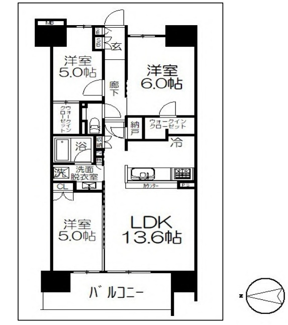 | 間取 | 3LDK (LDK13.6帖、洋室6帖、洋室5帖、洋室5帖) | ||