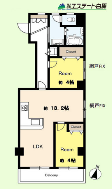 | 間取 | 2LDK (洋室4帖、LDK13.2帖、洋室4.1帖) | ||