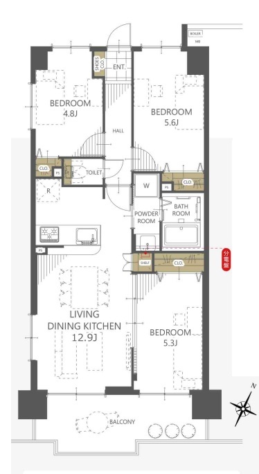 | 間取 | 3LDK (LDK12.9帖、洋室5.6帖、洋室5.3帖、洋室4.8帖) | ||
