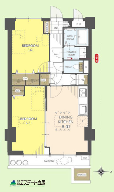 | 間取 | 2DK (洋室6.2帖、洋室5.6帖、DK8帖) | ||