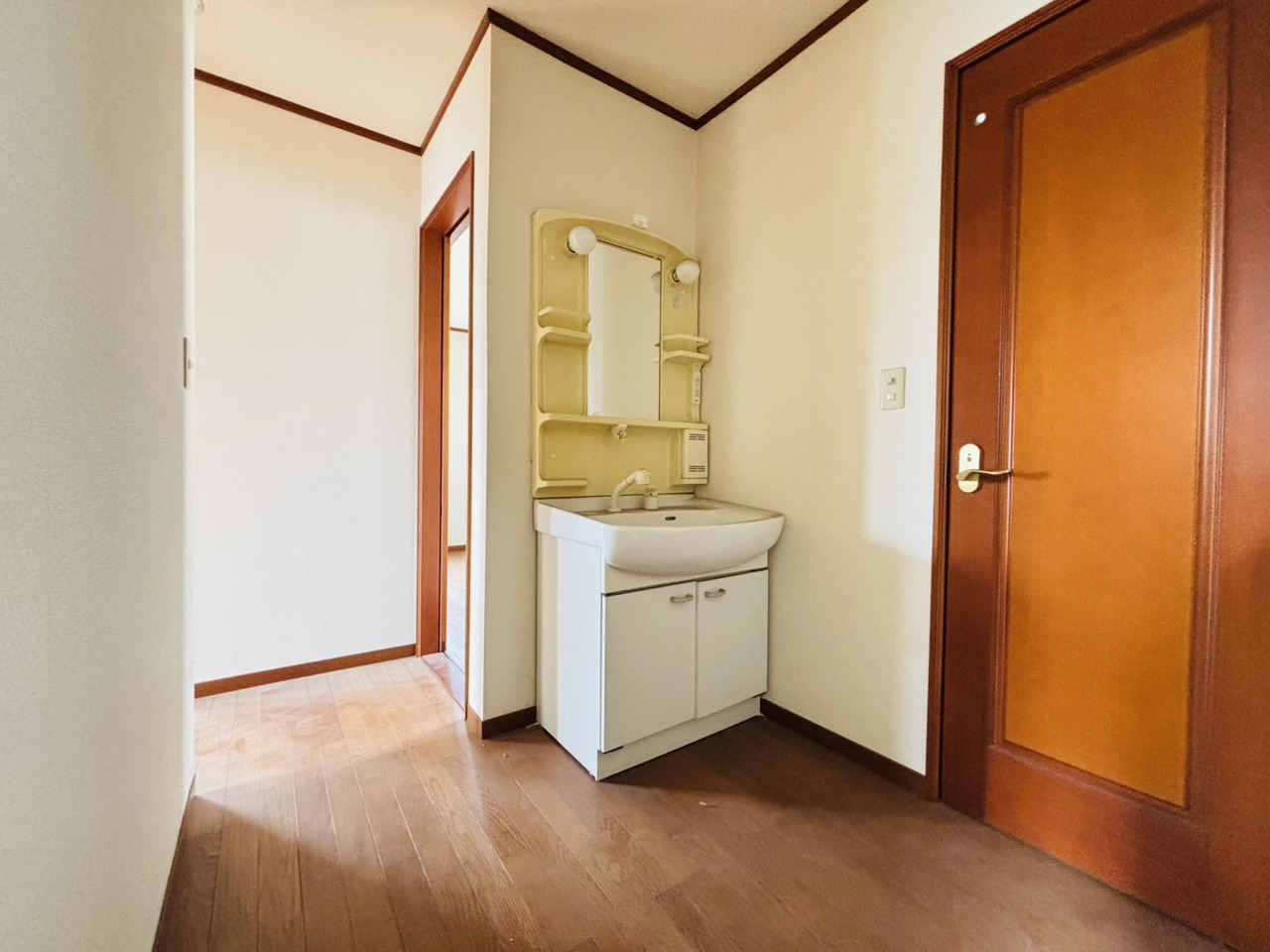 洗面台横にランドリーコーナーもゆったり。ドラム式洗濯機も置けそう。