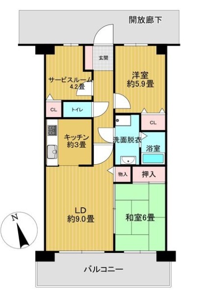 | 間取 | 2SLDK (LD9帖、K3帖、和室6帖、洋室5.9帖、S4.2帖) | ||