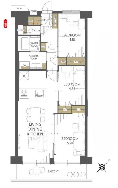 | 間取 | 3LDK + 洋5.9×1・洋4.8×1・洋4.3×1・LDK14.4×1 | ||