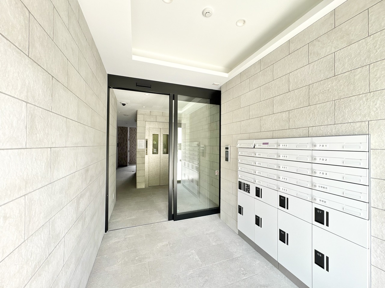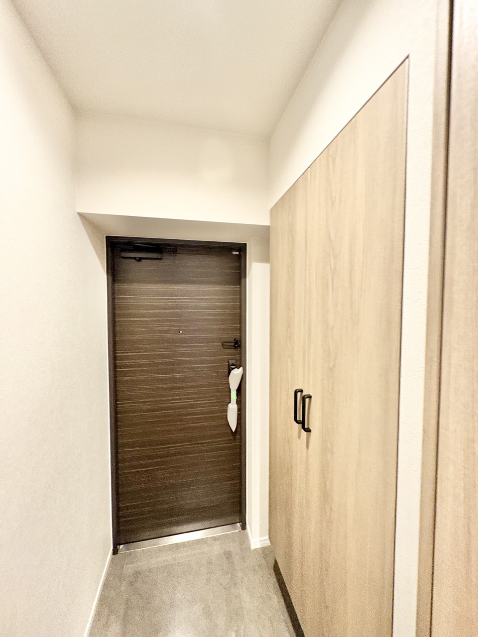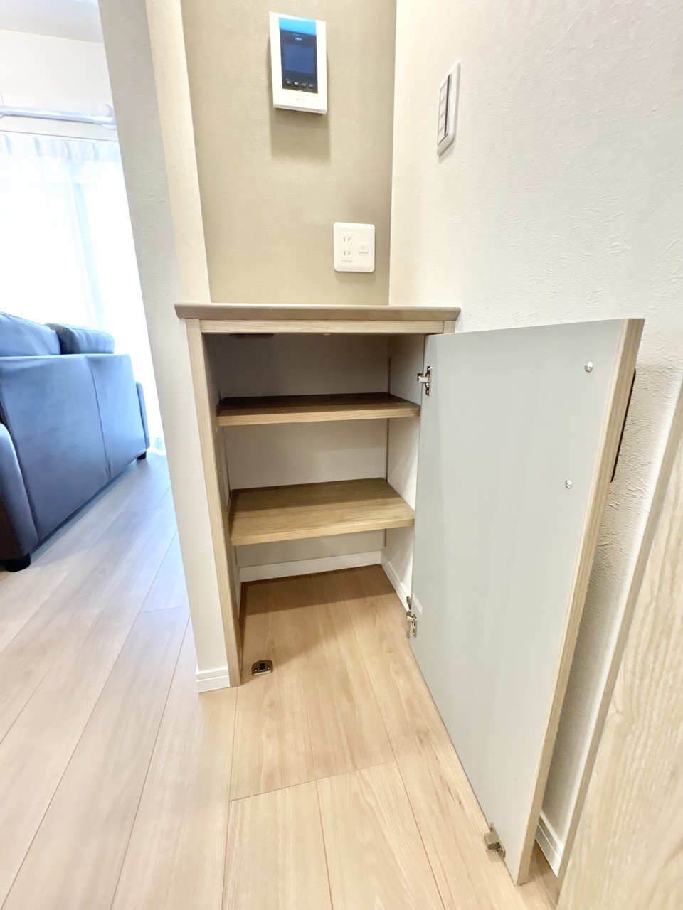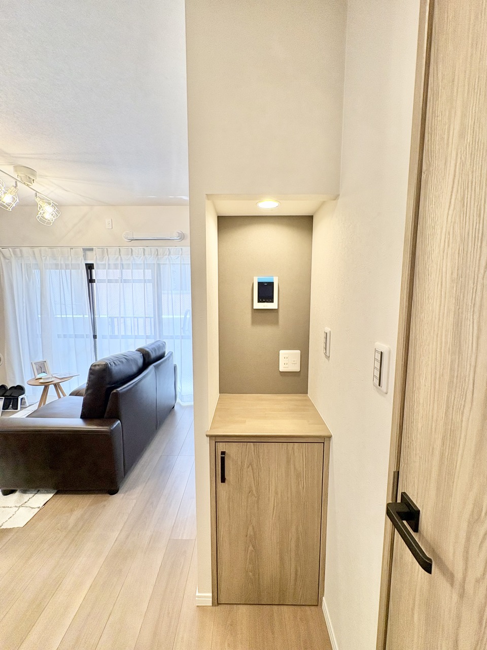 木目調の収納と洗練された空間が調和するエントランス。
