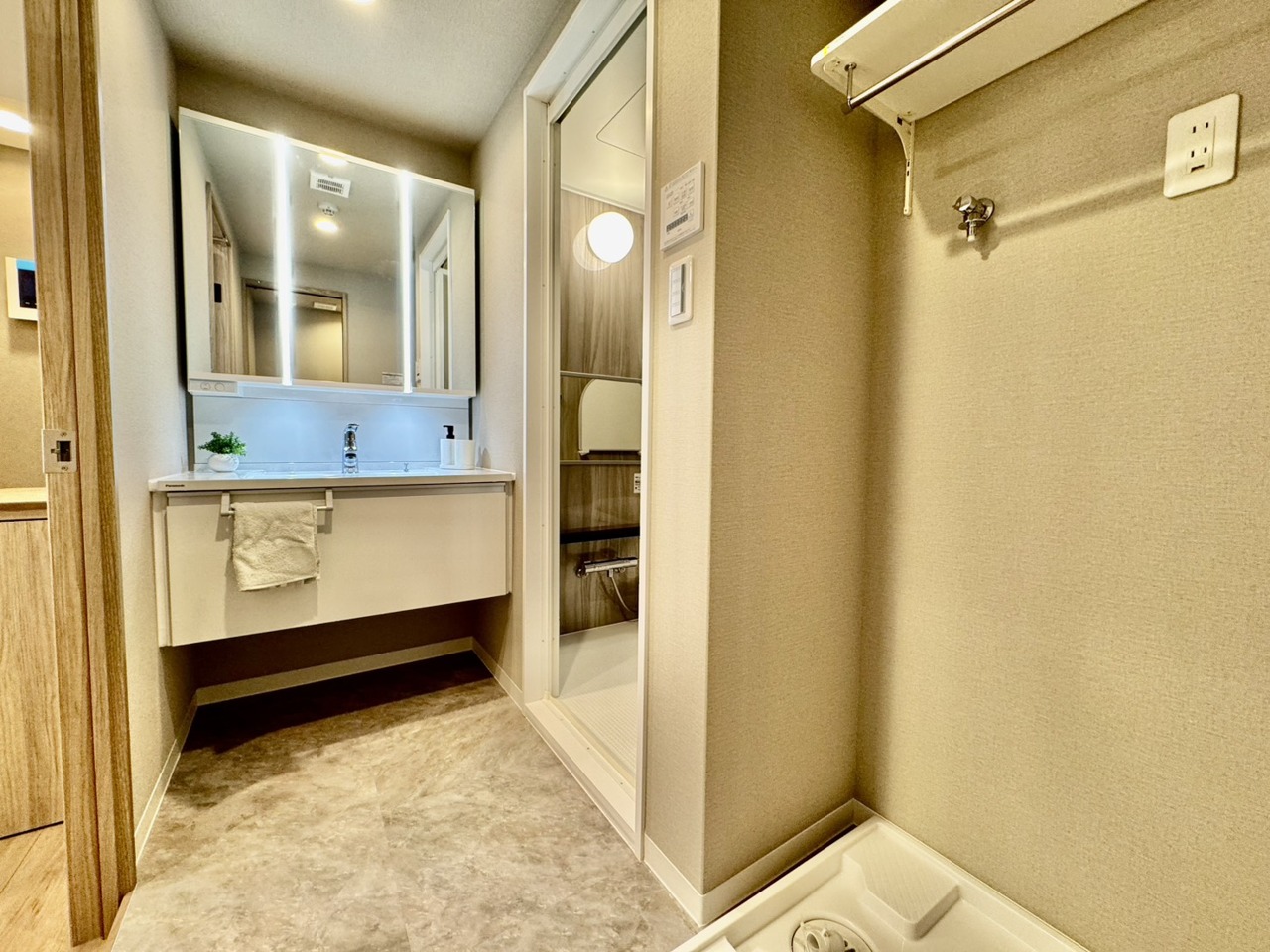 収納豊富な三面鏡付洗面化粧台。水回りのあれこれがキレイに収まりそうですね。