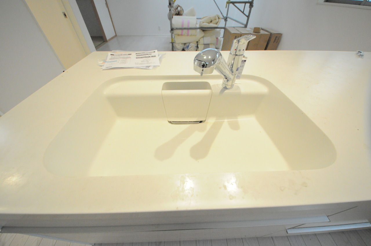 人工大理石を使用したシステムキッチン。永く傷つきにくく、お手入れもしやすい高機能性です。