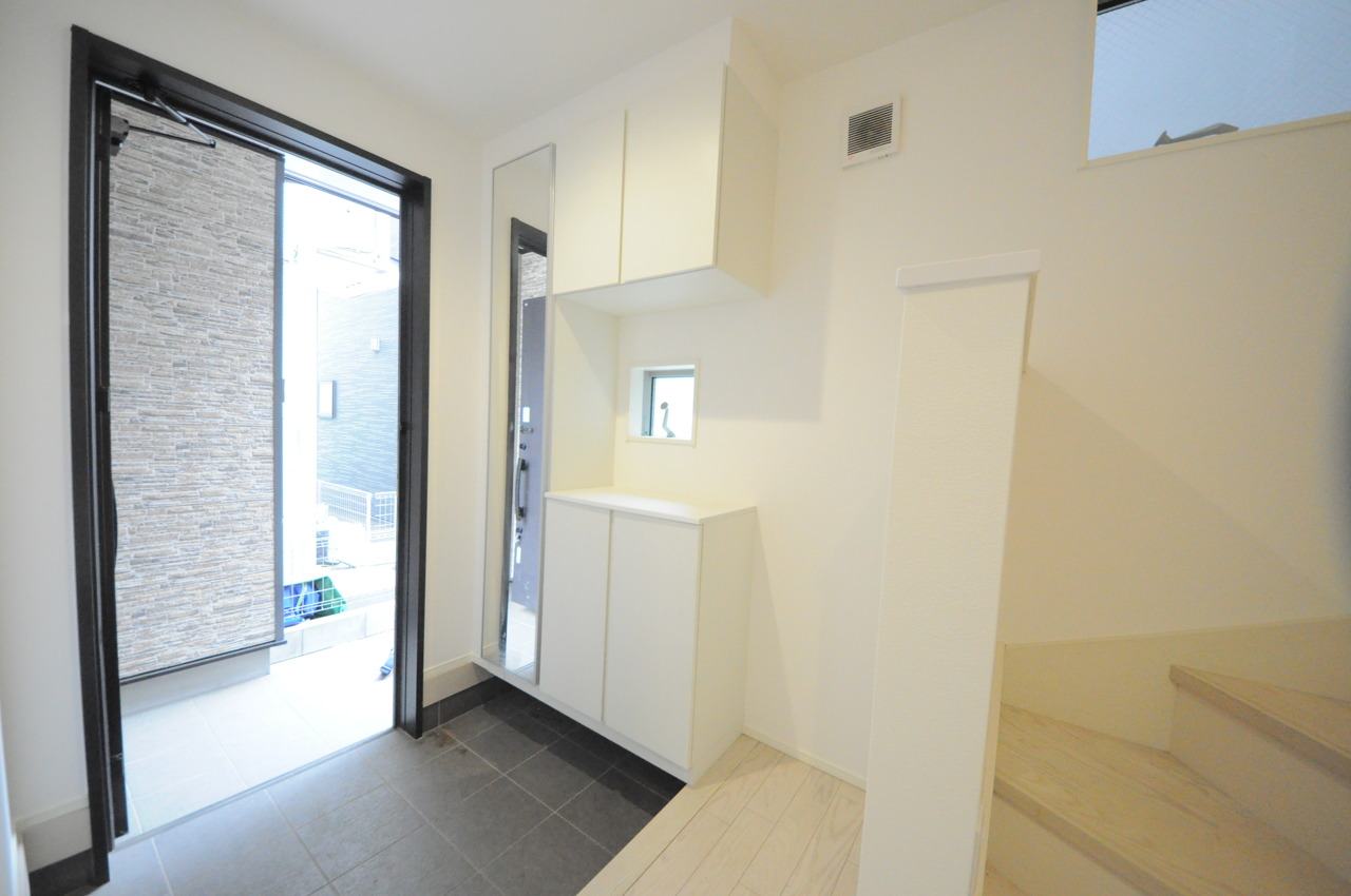 お宅の顔となる明るく開放的な玄関。ご家族皆様様の靴を収納できるスペースと全身鏡があり、お出掛け前に身だしなみチェックもできます。