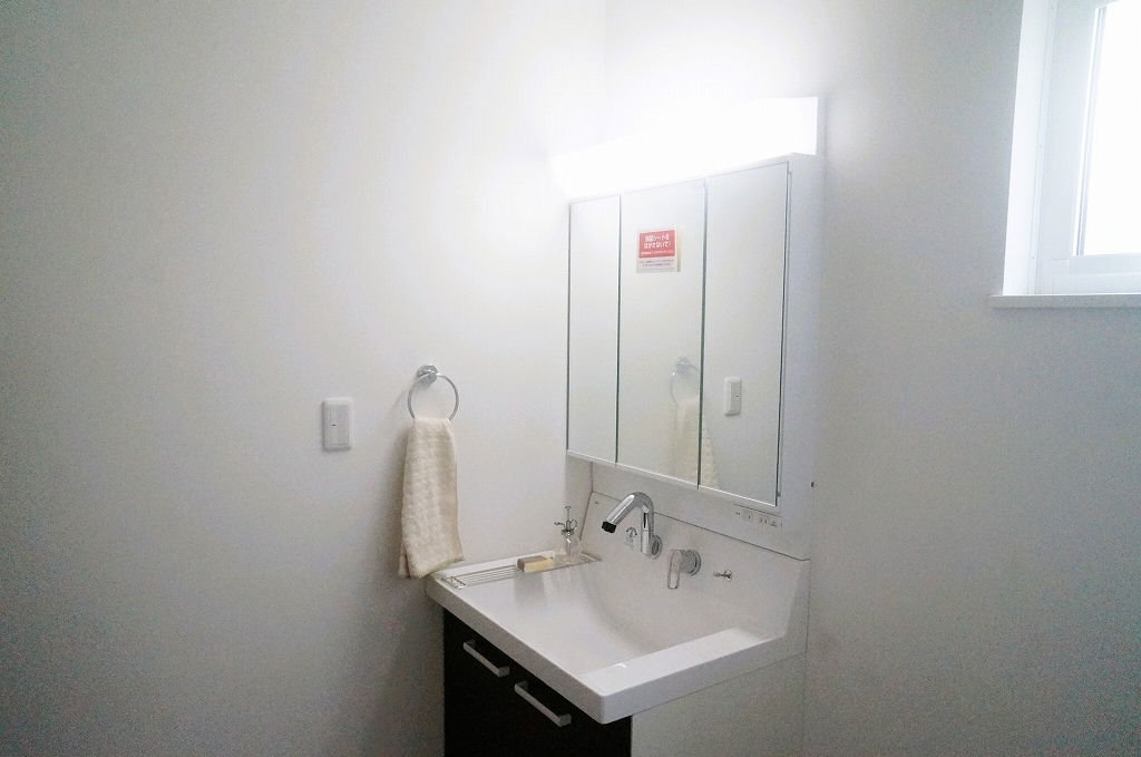 三面鏡を採用した洗面化粧台。鏡の裏にも収納スペースがあります。