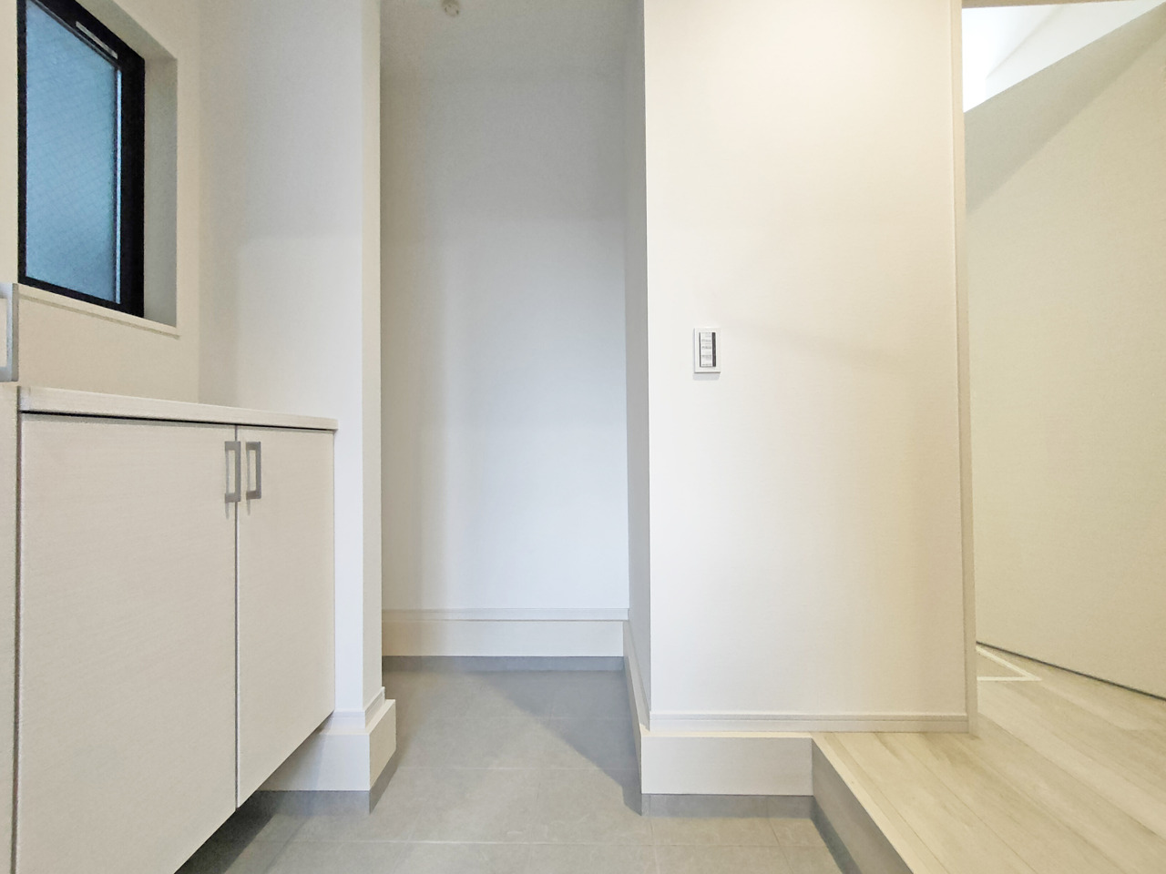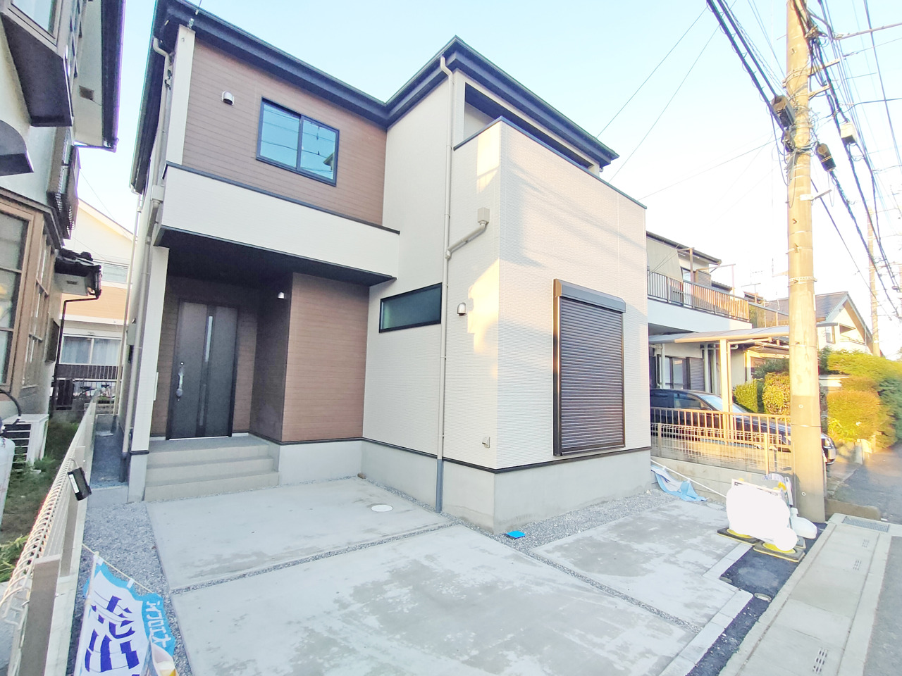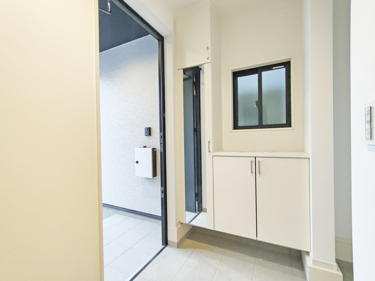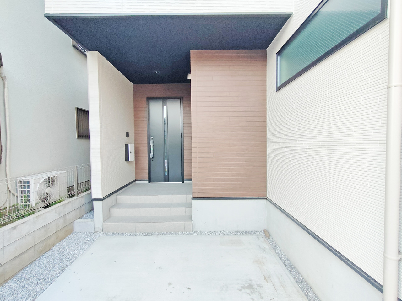 ポーチのついた新築分譲物件。玄関の印象はいかがでしょうか?入口からご覧ください。