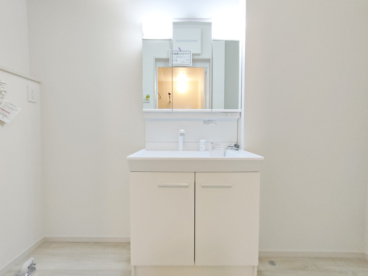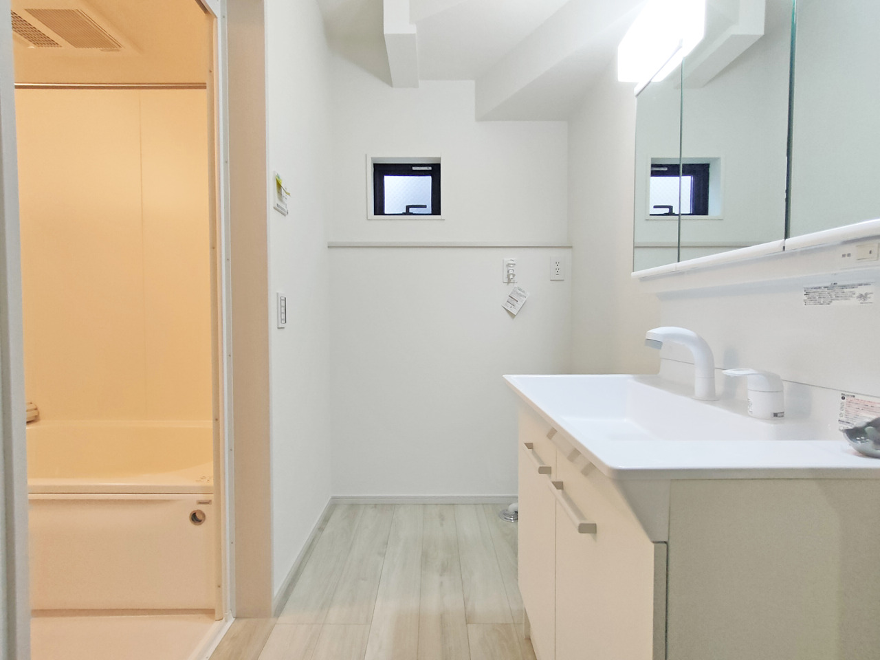 三面鏡にハンドシャワー付き、 使いやすい洗面台。
