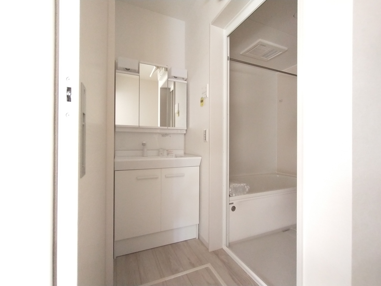 洗面化粧台は清潔感の漂うホワイトをベースカラーに、シンプルなデザインで。