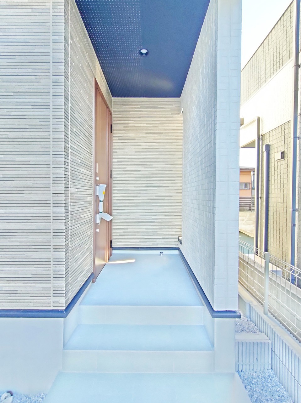 ポーチのついた新築分譲物件。玄関の印象はいかがでしょうか?入口からご覧ください。